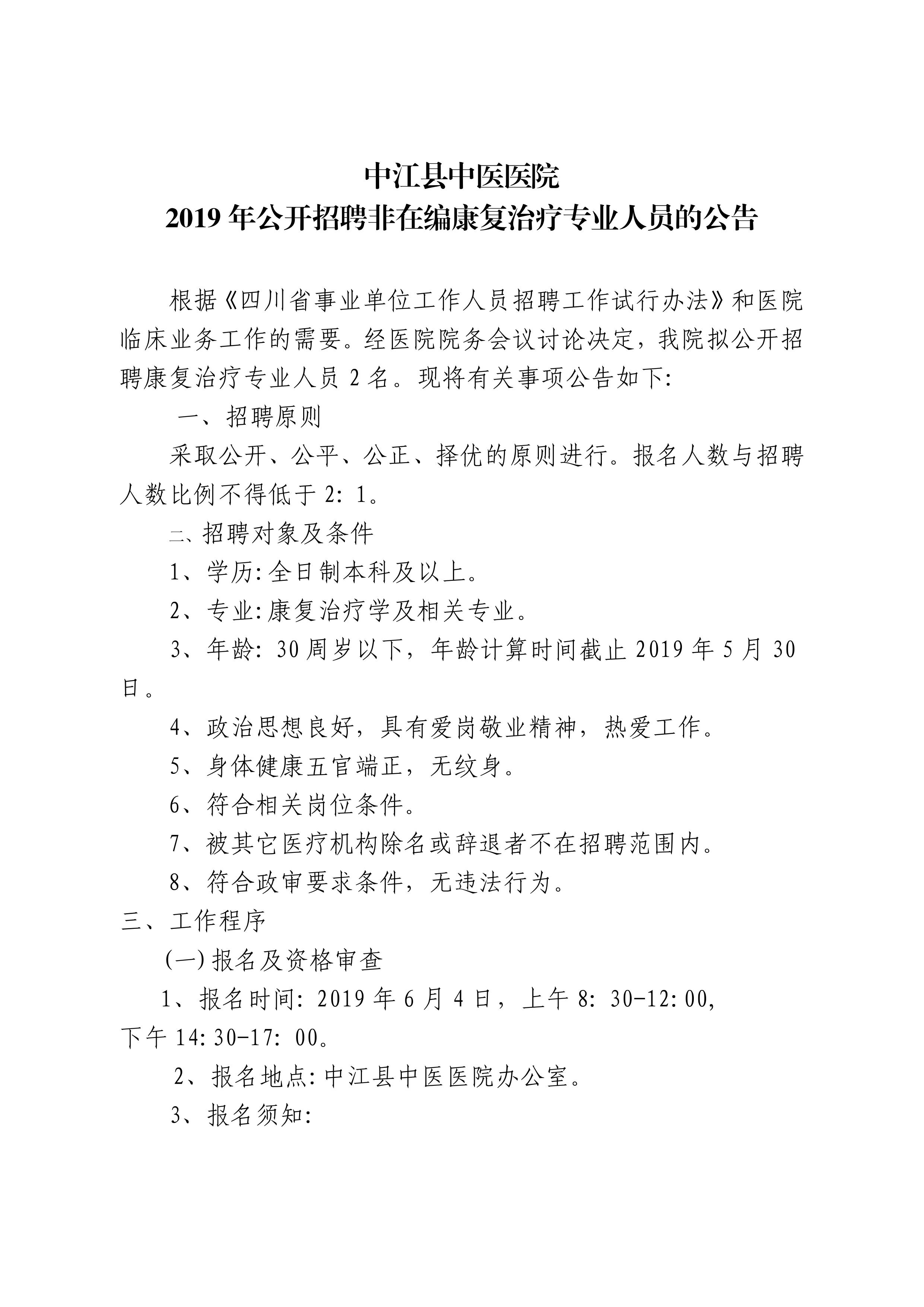 中江县中医医院 2019 年公开招聘非在编康复治疗专业人员的公告