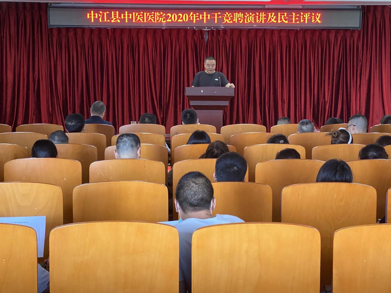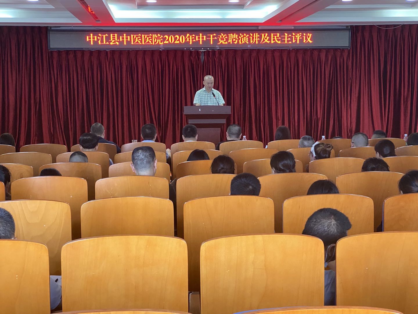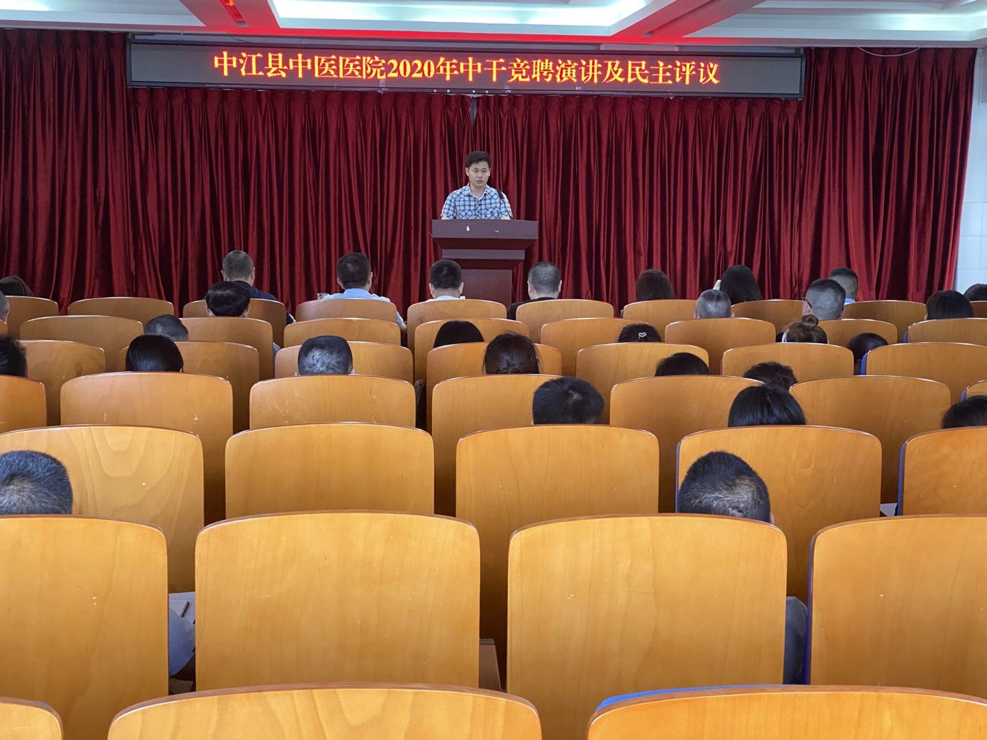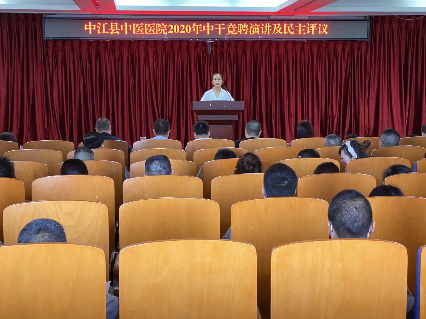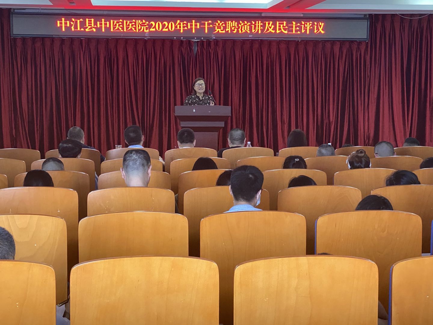 根据中江县卫健局《关于规范医疗卫生机构内设机构负责人(院内中层干部)选任管理的通知》文件精神,巩固“二级甲等中医医院”成果,奠定创建“三级乙等中医医院”基础,根据医院发展需要,经县卫健局审批,支委会、院委会研究决定,我院制订了《中层干部竞争上岗实施方案》,通过公布职位、公开报名,经过严格的资格审查,我院共12名同志符合竞聘条件,参与9个中层干部岗位的公开竞聘。