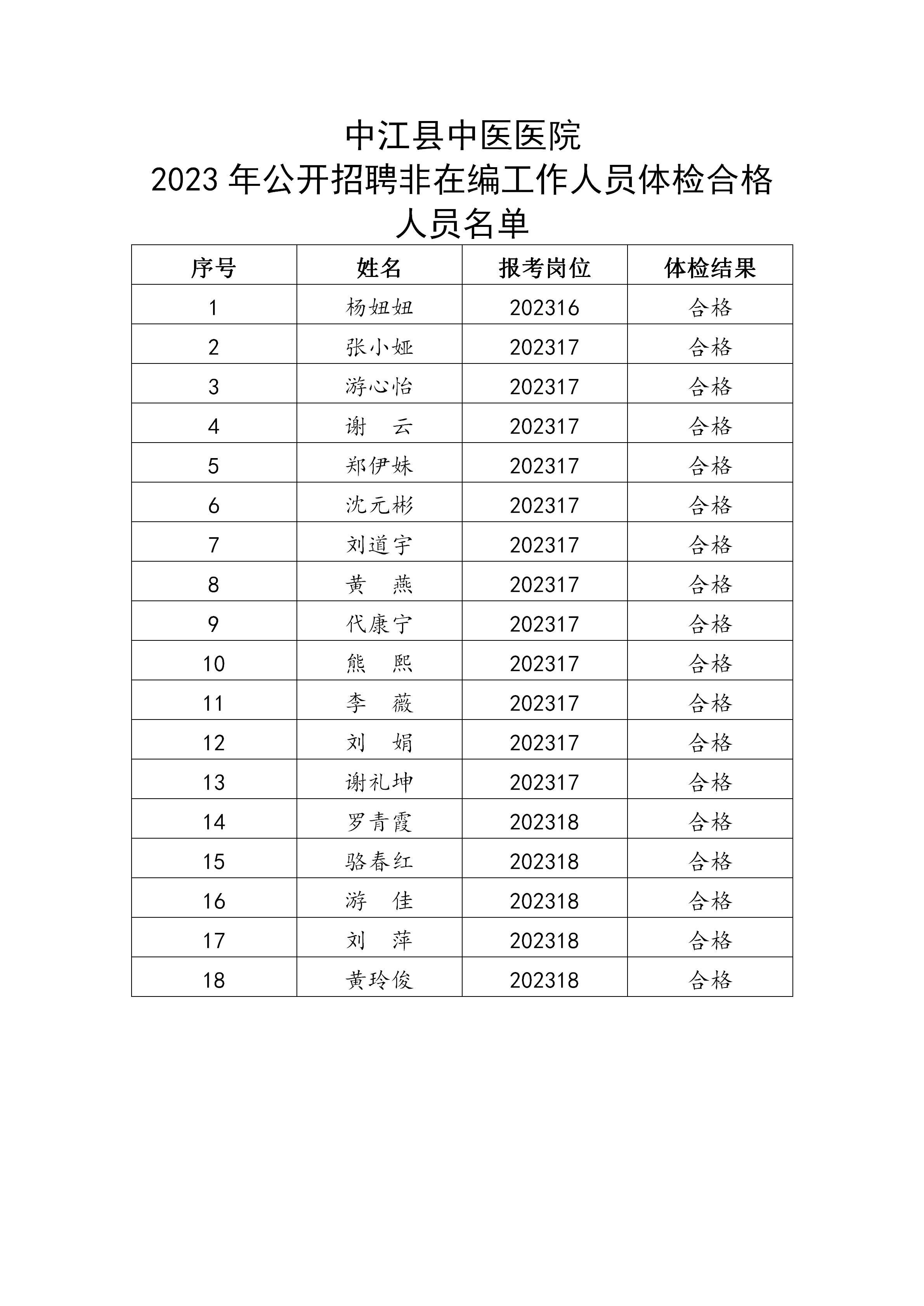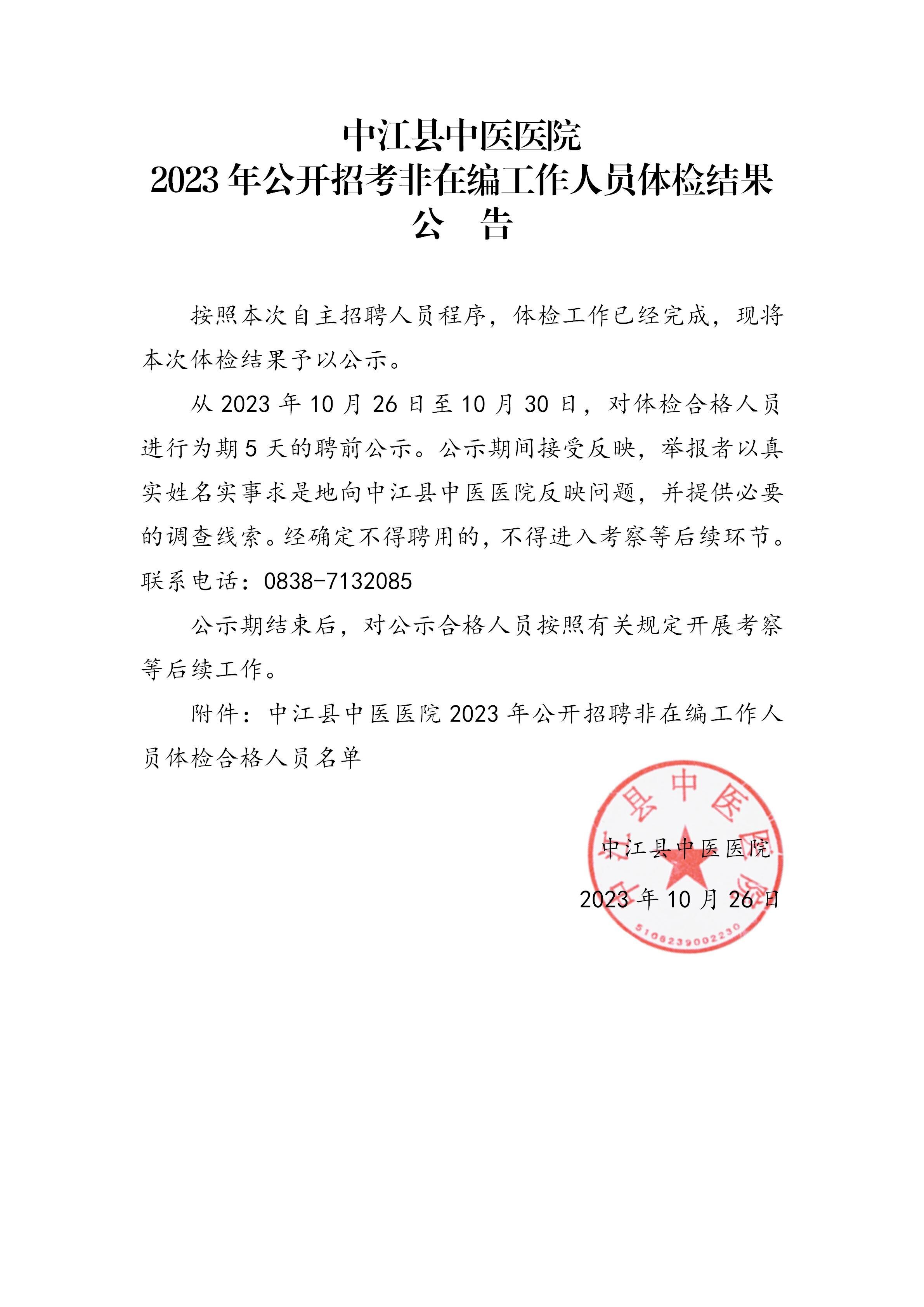 中江县中医医院2023年公开招考非在编工作人员体检结果