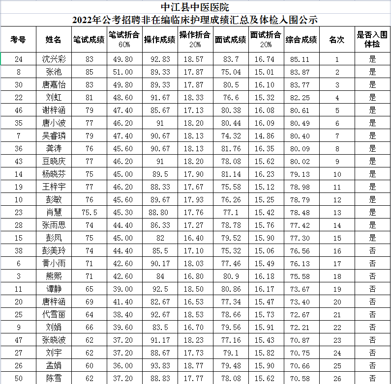 中江县中医医院 公开招考非在编工作人员成绩及体检公告