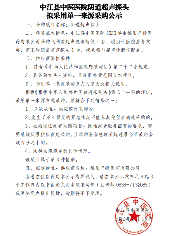 中江县中医医院阴道超声探头 拟采用单一来源采购公示