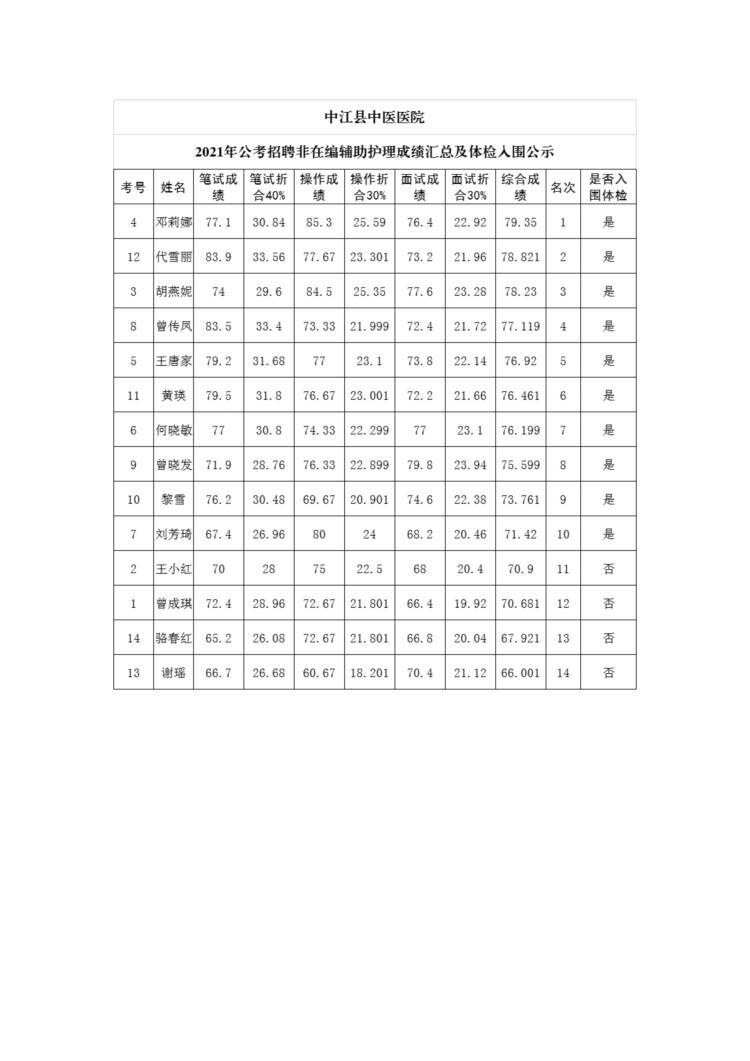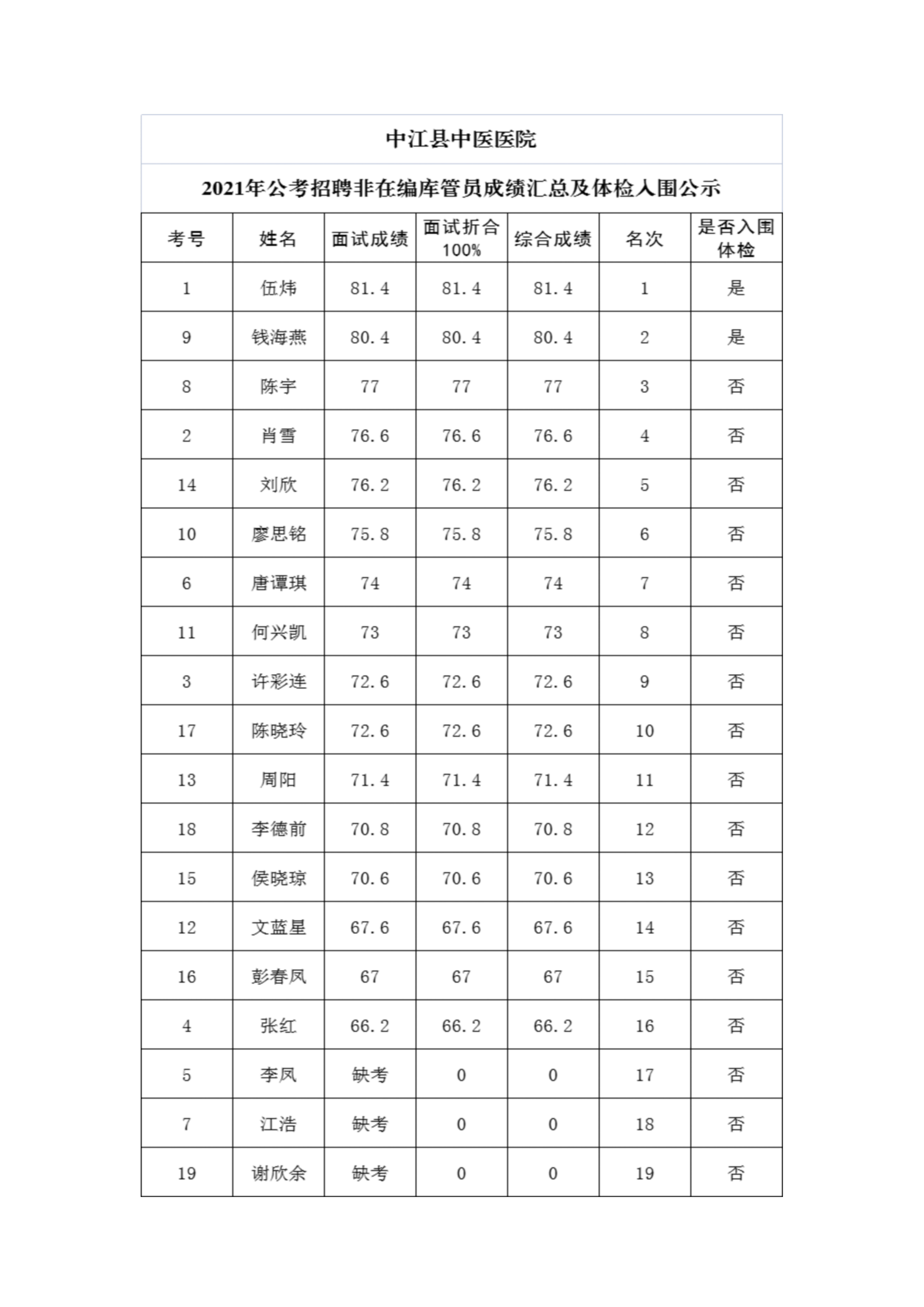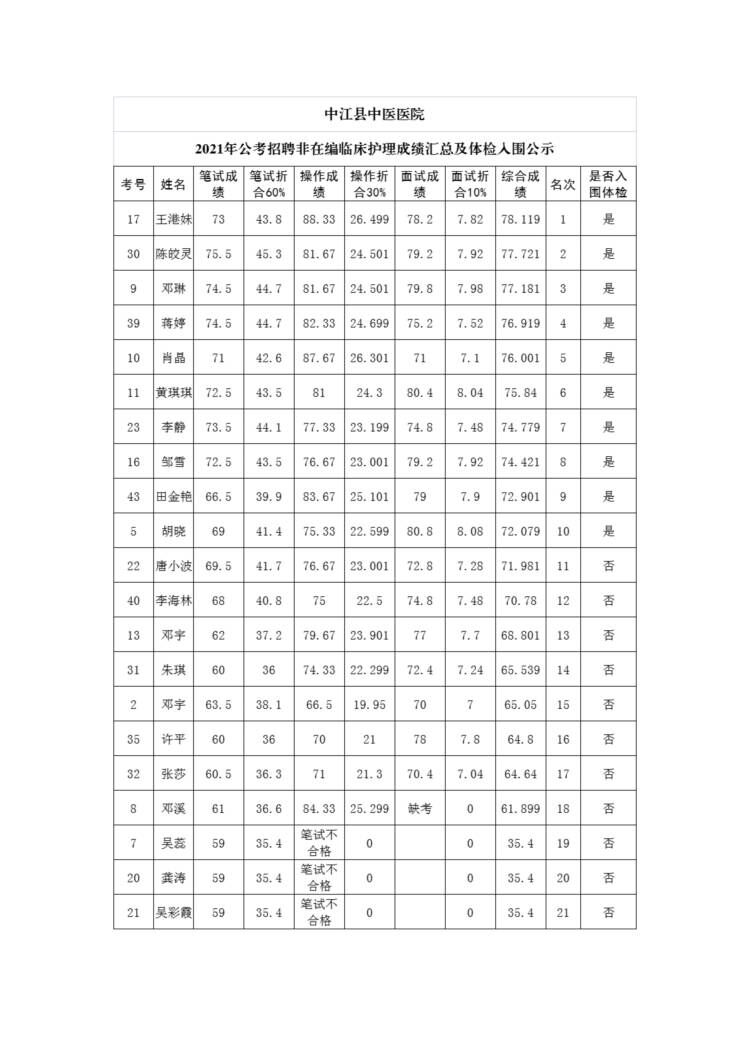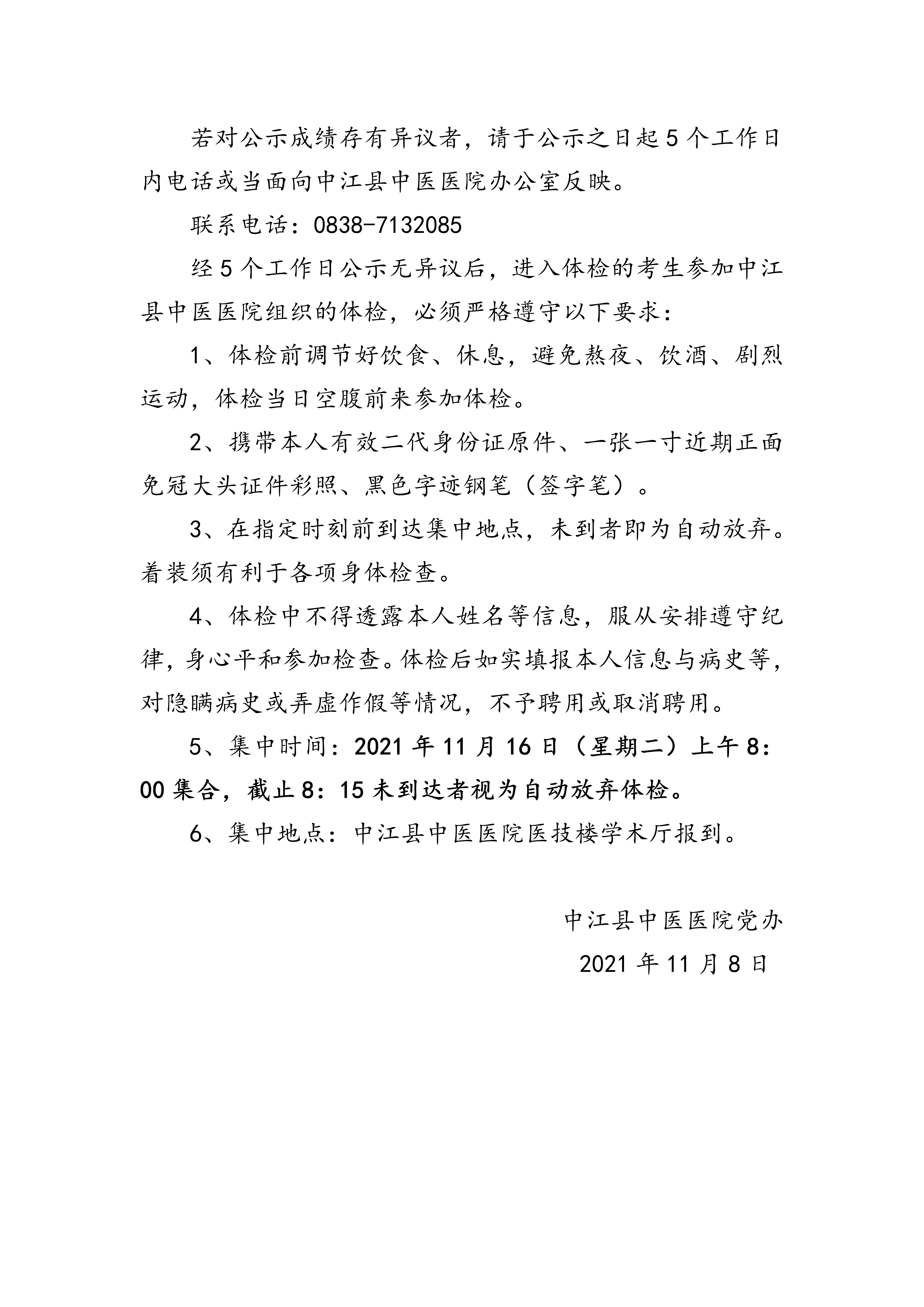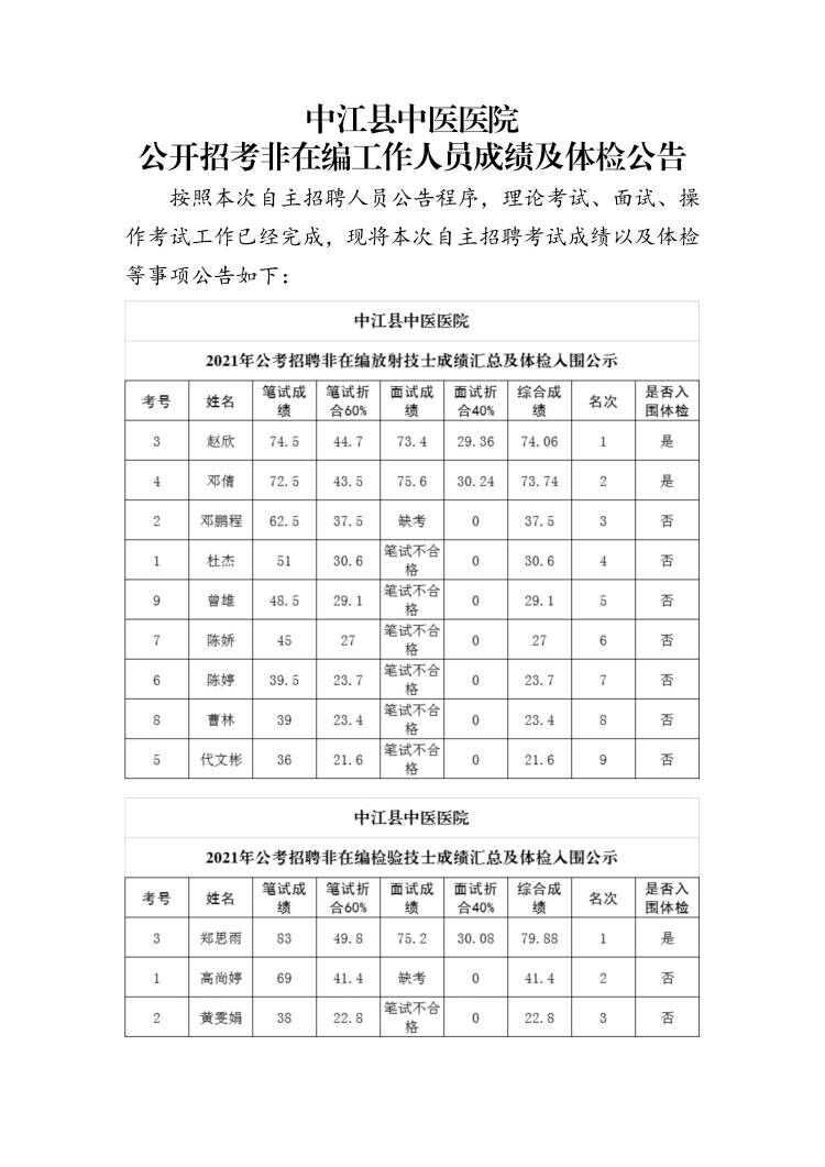 中江县中医医院2021公开招考非在编工作人员成绩及体检公告