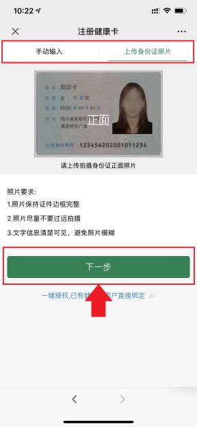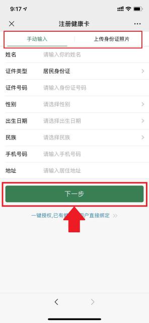 3.填写基本信息姓名、身份证号、性别、联系电话,地址,填写无误后,点击下一步按钮,该步骤可以通过手工录入或者拍摄身份证正面,录入注册的基本信息。
