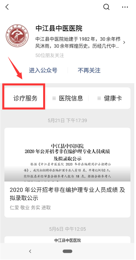 1.在微信公众号搜索“中江县中医医院”,点击“诊疗服务”,找到电子健康卡。